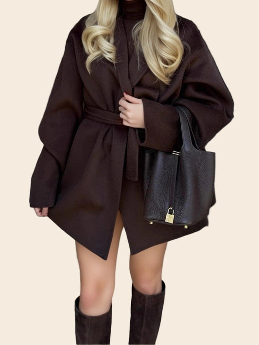 Benthe | Donkerbruine wollen mantel met ceintuur