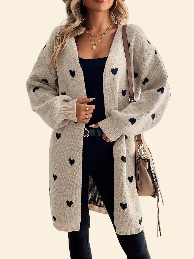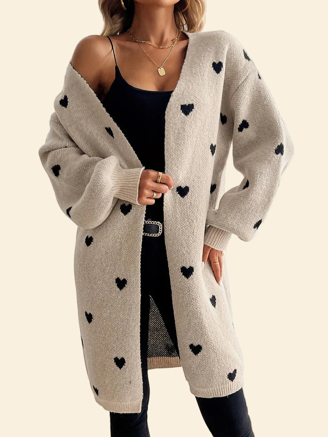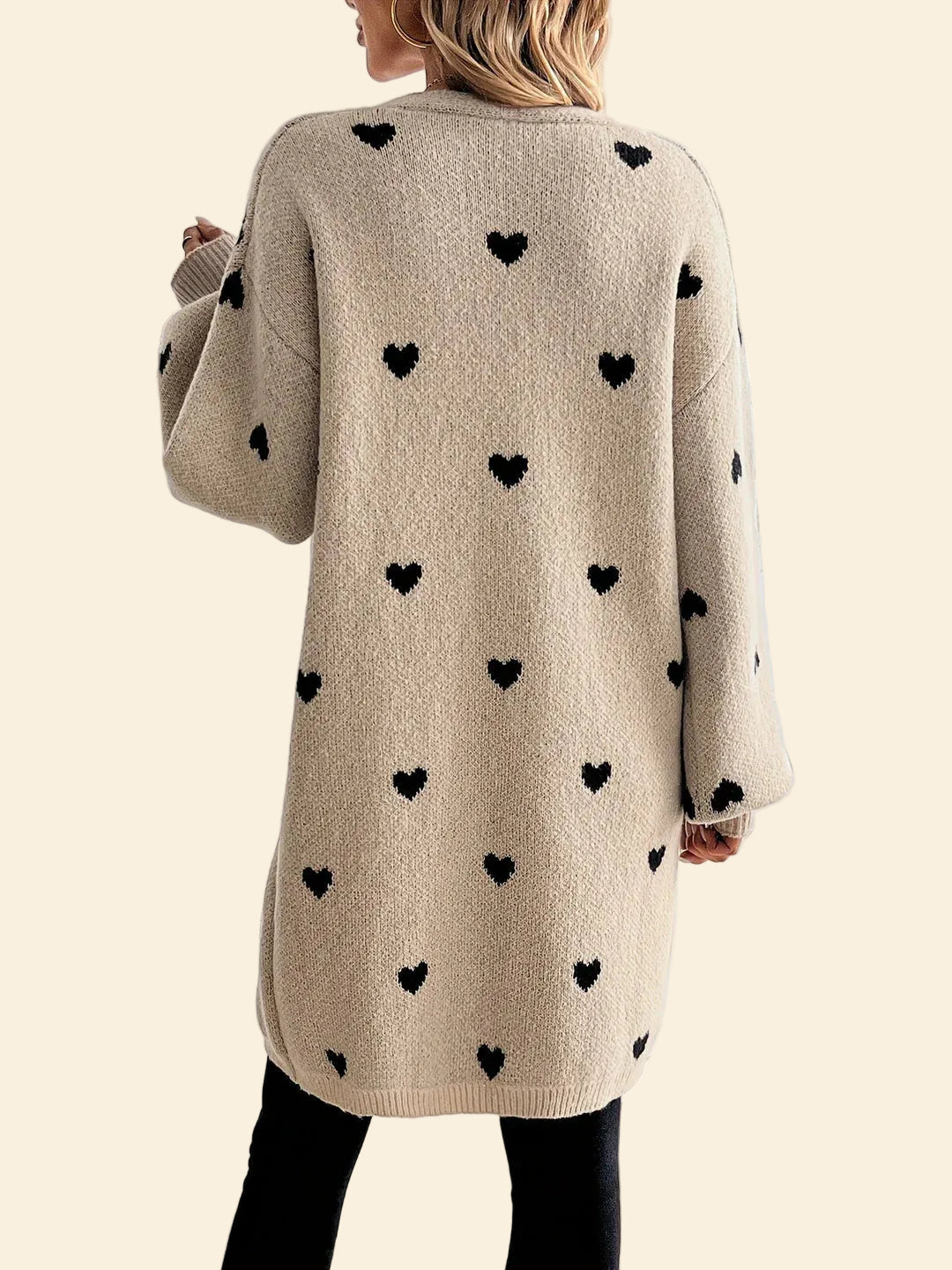 De Mira lange gebreide cardigan combineert ultiem comfort met een charmante uitstraling. De zachte beige kleur met kleine zwarte hartjes geeft het vest een subtiel vrouwelijk en vrolijk accent. De lange, soepel vallende pasvorm voelt heerlijk knus aan, terwijl de lichte wol- of acrylmix warmte biedt zonder zwaar te worden — perfect voor ieder seizoen.